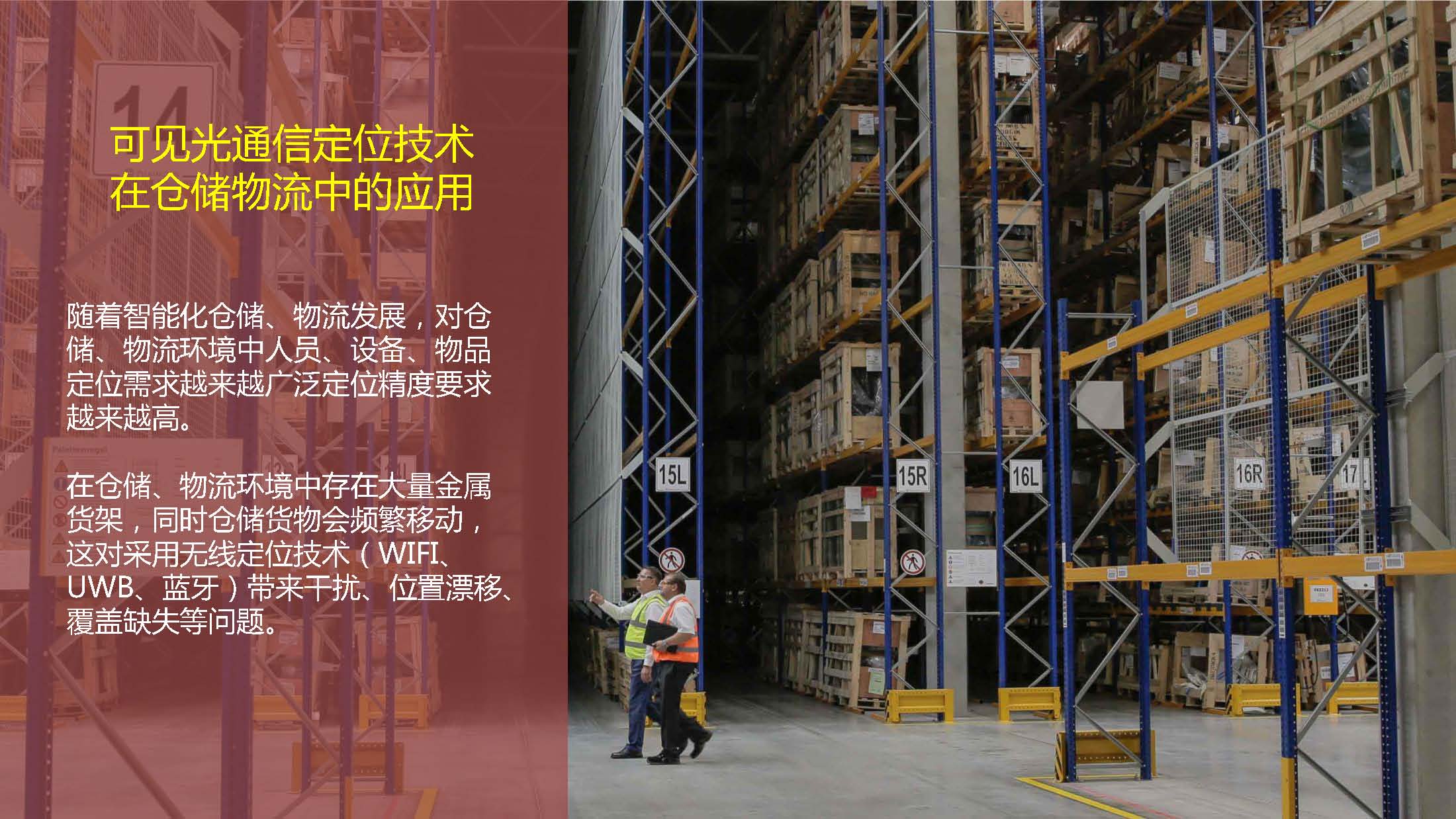 倉儲物(wù)流照(zhào)明(míng)系統是(shì)不(bù)可(kě)缺少α•₹✔(shǎo)的(de)基礎設施之一(yī),也(yě)是(shì)倉儲環境能(néng£σ♠γ)耗的(de)主要(yào)來(lái)源。倉儲環境照(zhào)明(míng)±"₩系統,利用(yòng)可(kě)見(jiàn)光(guāng)通(tōng)信定位技(π♥jì)術(shù)可(kě)以實現(xiàn):照(zhào)明(míng)的(d'βφe)同時(shí),提供人(rén)員(yuán)、移動設備、物(☆'wù)品的(de)定位、室內(nèi)導航及遠(yuǎn)程系統監視(sh>∑→ì)。